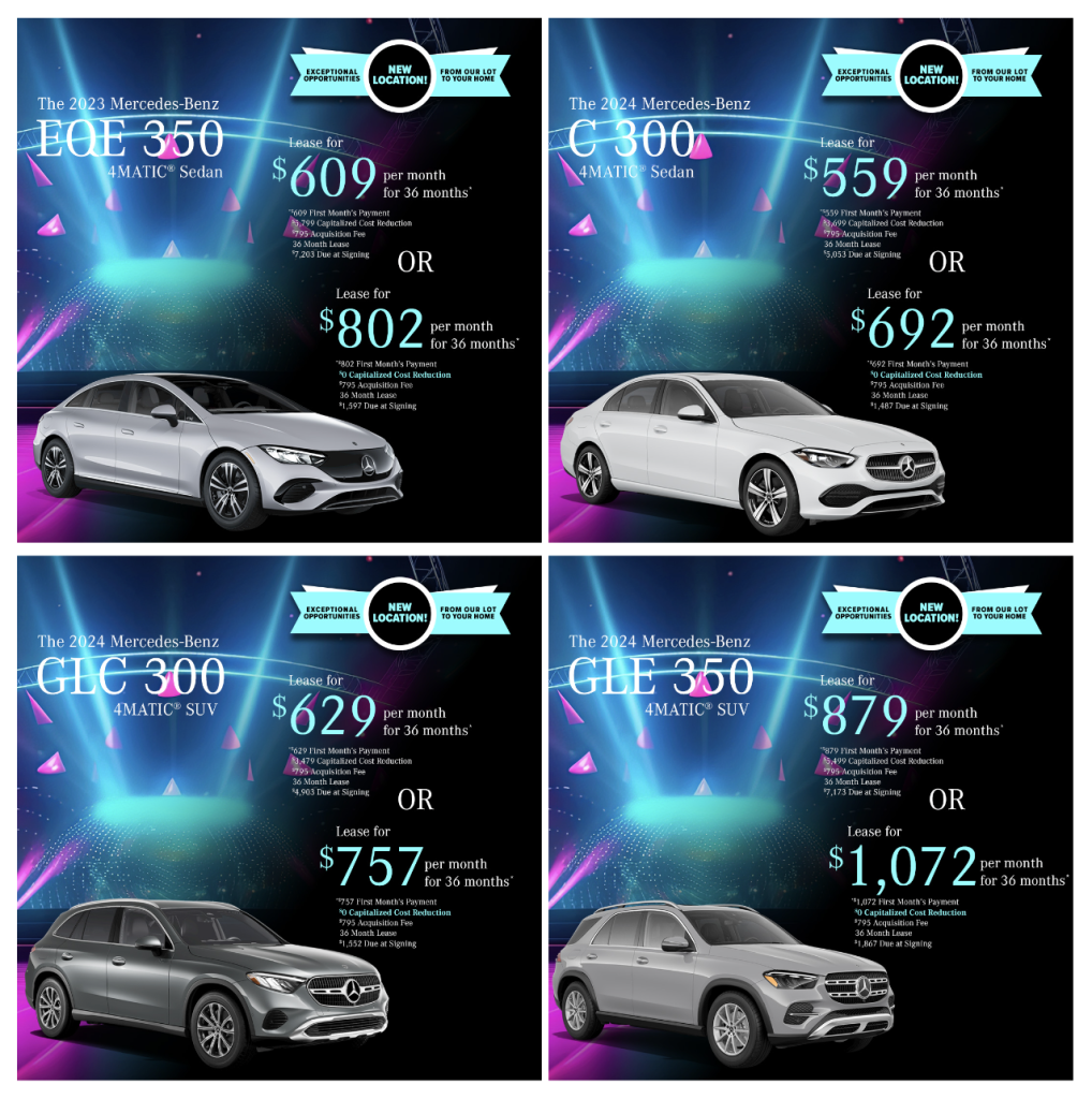 This June, Mercedes-Benz of Danbury is excited to present exclusive lease offers on four of our top models: the sleek C 300, the innovative EQE 350, the versatile GLE 350, and the dynamic GLC 300. Whether you’re seeking luxury, performance, or cutting-edge technology, these exceptional vehicles are available all month long with unbeatable lease options. Don’t miss your chance to drive home in your dream Mercedes at a fantastic price. Visit us today and experience the excellence that only Mercedes-Benz can offer.