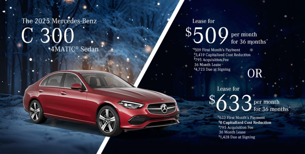 *2025 Mercedes-Benz C 300 4MATIC® Sedan, Available only to qualified customers through Mercedes-Benz Financial Services at participating authorized Mercedes-Benz dealers through January 31, 2025. Not everyone will qualify. Advertised 36 months lease payment based on MSRP of $51,600 less the suggested dealer contribution of $4,172 resulting in a total gross capitalized cost of $48,223. Dealer sets the final price. Dealer’s contribution vary and could affect your actual lease payment. Includes Destination Charge. Excludes title, taxes, registration, license fees, insurance, dealer prep and additional options. Specific vehicles are subject to availability and may have to be ordered. See participating dealer for details. Offer not valid in Puerto Rico. Tier III Lease: Total monthly payments equal $18,324. Cash due at signing includes $3,419 capitalized cost reduction, $795 acquisition fee, and first month’s lease payment of $509. Your acquisition fee vary by dealership. The acquisition fee charged by the dealer may affect the total cash due at signing. No security deposit required. Total payments equal $18,324. At lease end, lessee pays for any amounts due under the lease, any official fees and taxes related to the scheduled termination, excess wear and use plus $0.25/mile over 30,000 miles and a $595 vehicle turn-in fee. Purchase option at lease end for $29,928 plus taxes (and any other fees and charges due under the applicable lease agreement) in example shown. Sign & Drive Lease: Total monthly payments equal $22,788. Cash due at signing includes $0 capitalized cost reduction, $795 acquisition fee, and first month’s lease payment of $633. Your acquisition fee may vary by dealership. The acquisition fee charged by the dealer may affect the total cash due at signing. No security deposit required. Total payments equal $22,788. At lease end, lessee pays for any amounts due under the lease, any official fees and taxes related to the scheduled termination, excess wear and use plus $0.25/mile over 30,000 miles and a $595 vehicle turn-in fee. Purchase option at lease end for $29,928 plus taxes (and any other fees and charges due under the applicable lease agreement) in example shown.
