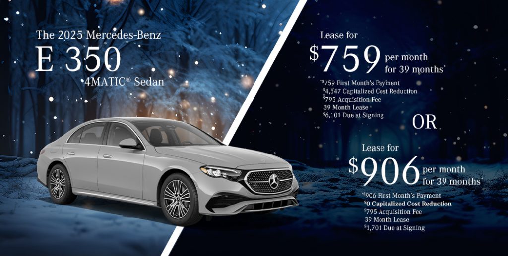 *2025 Mercedes-Benz E 350 4MATIC® Sedan, Available only to qualified customers through Mercedes-Benz Financial Services at participating authorized Mercedes-Benz dealers through January 31, 2025. Not everyone will qualify. Advertised 39 months lease payment based on MSRP of $66,102 less the suggested dealer contribution of $2,296 resulting in a total gross capitalized cost of $64,601. Dealer sets the final price. Dealer’s contribution vary and could affect your actual lease payment. Includes Destination Charge. Excludes title, taxes, registration, license fees, insurance, dealer prep and additional options. Specific vehicles are subject to availability and may have to be ordered. See participating dealer for details. Offer not valid in Puerto Rico. Tier III Lease: Total monthly payments equal $29,601. Cash due at signing includes $4,547 capitalized cost reduction, $795 acquisition fee, and first month’s lease payment of $759. Your acquisition fee vary by dealership. The acquisition fee charged by the dealer may affect the total cash due at signing. No security deposit required. Total payments equal $29,601. At lease end, lessee pays for any amounts due under the lease, any official fees and taxes related to the scheduled termination, excess wear and use plus $0.25/mile over 30,000 miles and a $595 vehicle turn-in fee. Purchase option at lease end for $36,356 plus taxes (and any other fees and charges due under the applicable lease agreement) in example shown. Sign & Drive Lease: Total monthly payments equal $35,334. Cash due at signing includes $0 capitalized cost reduction, $795 acquisition fee, and first month’s lease payment of $906. Your acquisition fee may vary by dealership. The acquisition fee charged by the dealer may affect the total cash due at signing. No security deposit required. Total payments equal $35,334. At lease end, lessee pays for any amounts due under the lease, any official fees and taxes related to the scheduled termination, excess wear and use plus $0.25/mile over 30,000 miles and a $595 vehicle turn-in fee. Purchase option at lease end for $36,356 plus taxes (and any other fees and charges due under the applicable lease agreement) in example shown.