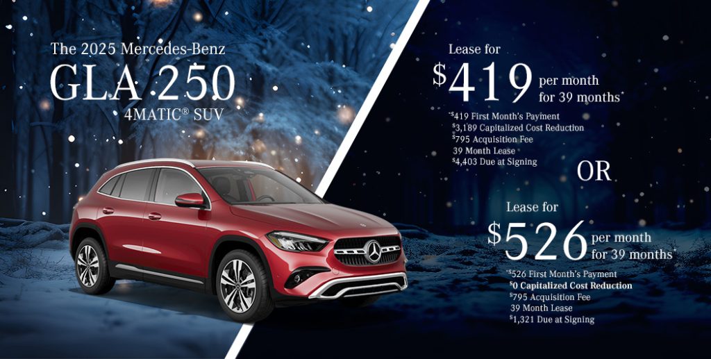 *2025 Mercedes-Benz GLA 250 4MATIC® SUV, Available only to qualified customers through Mercedes-Benz Financial Services at participating authorized Mercedes-Benz dealers through January 31, 2025. Not everyone will qualify. Advertised 39 months lease payment based on MSRP of $46,150 less the suggested dealer contribution of $3,713 resulting in a total gross capitalized cost of $42,232. Dealer sets the final price. Dealer’s contribution vary and could affect your actual lease payment. Includes Destination Charge. Excludes title, taxes, registration, license fees, insurance, dealer prep and additional options. Specific vehicles are subject to availability and may have to be ordered. See participating dealer for details. Offer not valid in Puerto Rico. Tier III Lease: Total monthly payments equal $16,341. Cash due at signing includes $3,189 capitalized cost reduction, $795 acquisition fee, and first month’s lease payment of $419. Your acquisition fee vary by dealership. The acquisition fee charged by the dealer may affect the total cash due at signing. No security deposit required. Total payments equal $16,341. At lease end, lessee pays for any amounts due under the lease, any official fees and taxes related to the scheduled termination, excess wear and use plus $0.25/mile over 30,000 miles and a $595 vehicle turn-in fee. Purchase option at lease end for $25,844 plus taxes (and any other fees and charges due under the applicable lease agreement) in example shown. Sign & Drive Lease: Total monthly payments equal $20,514. Cash due at signing includes $0 capitalized cost reduction, $795 acquisition fee, and first month’s lease payment of $526. Your acquisition fee may vary by dealership. The acquisition fee charged by the dealer may affect the total cash due at signing. No security deposit required. Total payments equal $20,514. At lease end, lessee pays for any amounts due under the lease, any official fees and taxes related to the scheduled termination, excess wear and use plus $0.25/mile over 30,000 miles and a $595 vehicle turn-in fee. Purchase option at lease end for $25,844 plus taxes (and any other fees and charges due under the applicable lease agreement) in example shown.