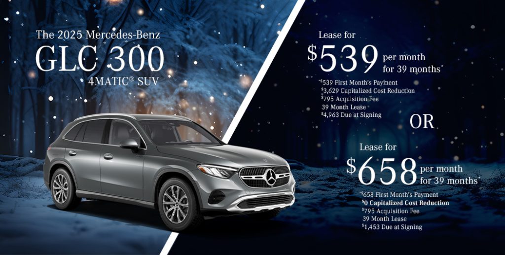 *2025 Mercedes-Benz GLC 300 4MATIC® , Available only to qualified customers through Mercedes-Benz Financial Services at participating authorized Mercedes-Benz dealers through January 31, 2025. Not everyone will qualify. Advertised 39 months lease payment based on MSRP of $52,402 less the suggested dealer contribution of $1,758 resulting in a total gross capitalized cost of $51,439. Dealer sets the final price. Dealer’s contribution vary and could affect your actual lease payment. Includes Destination Charge. Excludes title, taxes, registration, license fees, insurance, dealer prep and additional options. Specific vehicles are subject to availability and may have to be ordered. See participating dealer for details. Offer not valid in Puerto Rico. Tier III Lease: Total monthly payments equal $21,021. Cash due at signing includes $3,629 capitalized cost reduction, $795 acquisition fee, and first month’s lease payment of $539. Your acquisition fee vary by dealership. The acquisition fee charged by the dealer may affect the total cash due at signing. No security deposit required. Total payments equal $21,021. At lease end, lessee pays for any amounts due under the lease, any official fees and taxes related to the scheduled termination, excess wear and use plus $0.25/mile over 30,000 miles and a $595 vehicle turn-in fee. Purchase option at lease end for $29,869 plus taxes (and any other fees and charges due under the applicable lease agreement) in example shown. Sign & Drive Lease: Total monthly payments equal $25,662. Cash due at signing includes $0 capitalized cost reduction, $795 acquisition fee, and first month’s lease payment of $658. Your acquisition fee may vary by dealership. The acquisition fee charged by the dealer may affect the total cash due at signing. No security deposit required. Total payments equal $25,662. At lease end, lessee pays for any amounts due under the lease, any official fees and taxes related to the scheduled termination, excess wear and use plus $0.25/mile over 30,000 miles and a $595 vehicle turn-in fee. Purchase option at lease end for $29,869 plus taxes (and any other fees and charges due under the applicable lease agreement) in example shown.
