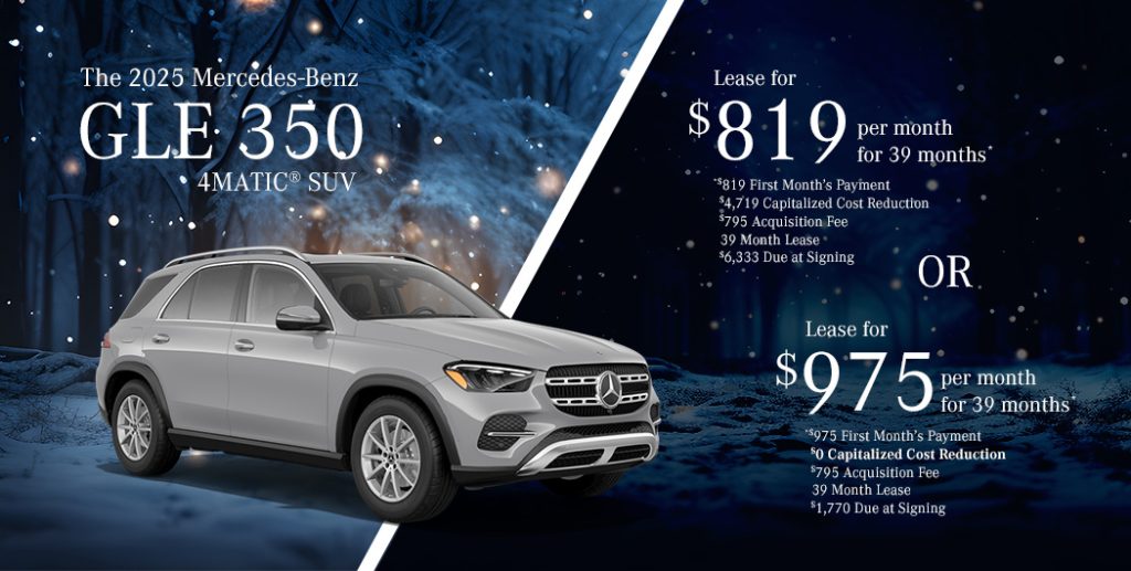 *2025 Mercedes-Benz GLE 350 4MATIC® SUV , Available only to qualified customers through Mercedes-Benz Financial Services at participating authorized Mercedes-Benz dealers through January 31, 2025. Not everyone will qualify. Advertised 39 months lease payment based on MSRP of $65,502 less the suggested dealer contribution of $2,162 resulting in a total gross capitalized cost of $63,340. Dealer sets the final price. Dealer’s contribution vary and could affect your actual lease payment. Includes Destination Charge. Excludes title, taxes, registration, license fees, insurance, dealer prep and additional options. Specific vehicles are subject to availability and may have to be ordered. See participating dealer for details. Offer not valid in Puerto Rico. Tier III Lease: Total monthly payments equal $31,941. Cash due at signing includes $4,719 capitalized cost reduction, $795 acquisition fee, and first month’s lease payment of $819. Your acquisition fee vary by dealership. The acquisition fee charged by the dealer may affect the total cash due at signing. No security deposit required. Total payments equal $31,941. At lease end, lessee pays for any amounts due under the lease, any official fees and taxes related to the scheduled termination, excess wear and use plus $0.25/mile over 30,000 miles and a $595 vehicle turn-in fee. Purchase option at lease end for $36,681 plus taxes (and any other fees and charges due under the applicable lease agreement) in example shown. Sign & Drive Lease: Total monthly payments equal $38,025. Cash due at signing includes $0 capitalized cost reduction, $795 acquisition fee, and first month’s lease payment of $975. Your acquisition fee may vary by dealership. The acquisition fee charged by the dealer may affect the total cash due at signing. No security deposit required. Total payments equal $38,025. At lease end, lessee pays for any amounts due under the lease, any official fees and taxes related to the scheduled termination, excess wear and use plus $0.25/mile over 30,000 miles and a $595 vehicle turn-in fee. Purchase option at lease end for $36,681 plus taxes (and any other fees and charges due under the applicable lease agreement) in example shown.